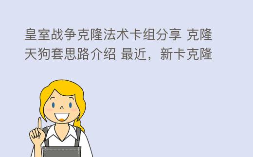 摘要:卡组新卡套路分析首先聊一下克隆法术的两个使用注意点:1.虽然克隆法术只有3级,但是它对目标的克隆几乎百分之百,除了血量外,目标的等级属性和亡语(重点)都会被克隆!2,被克隆的单位仅有1血,吃到塔伤和aoe必须,使用时必须提防对手的解牌,且前方有肉盾。3.克隆体不能被克隆,皇室战争克隆法术卡组分享 克隆天狗套思路介绍 最近,新卡克隆法术降临天梯,由于早前官方和著名玩家对其多有推荐,因此很快有玩家正在尝试克隆法术卡组,下面小编先来分享一套克隆天狗卡组,抛砖引玉。